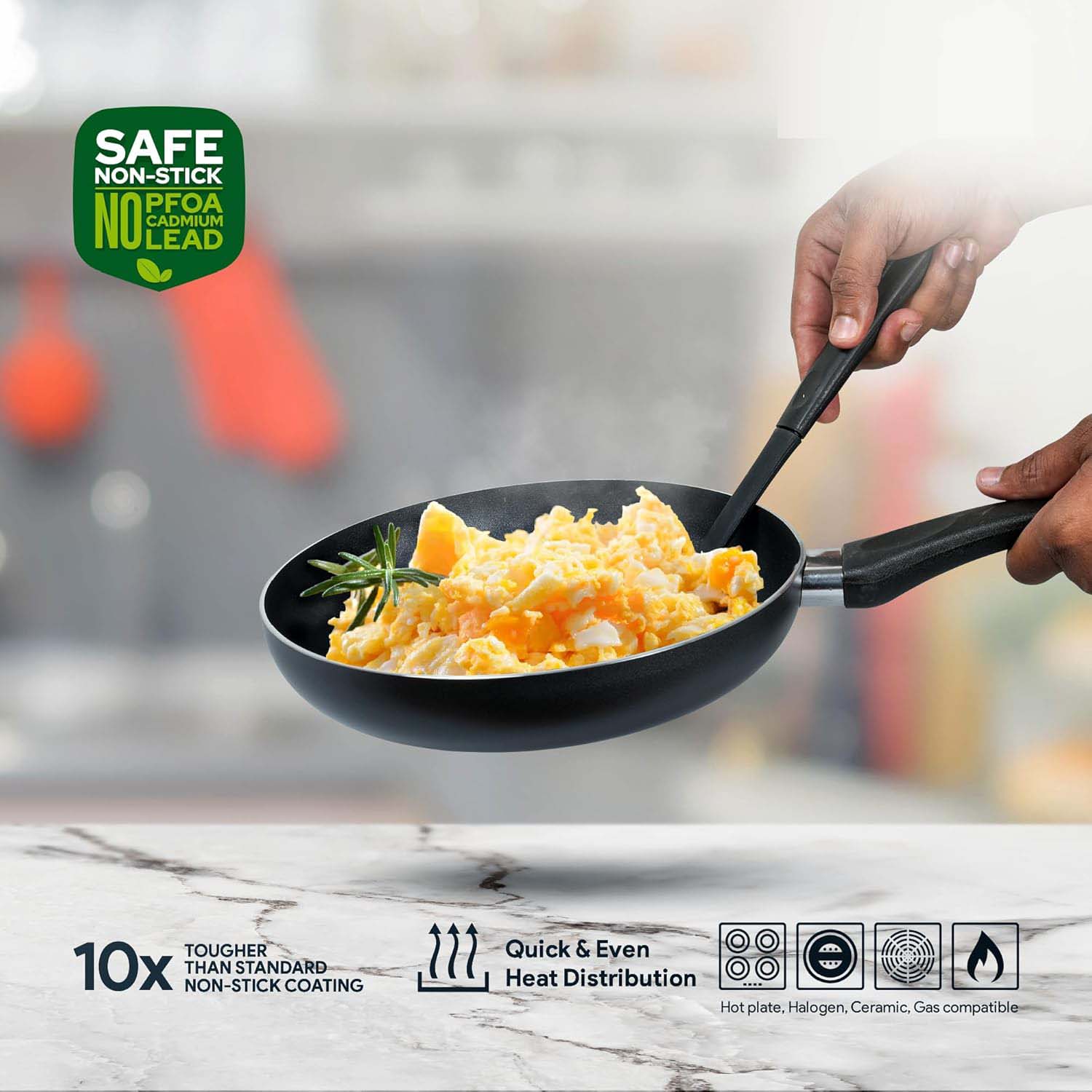 Elevate your cooking game with the 10-Piece Nonstick Cookware Set, a kitchen essential bundle designed to simplify meal preparation and cleanup. Made from high-quality aluminum, this set ensures even heat distribution, allowing you to achieve perfect cooking results every time. Whether you're frying, sautéing, boiling, or simmering, this versatile cookware set has everything you need to create delicious meals with ease.The set includes a variety of essential pieces: a casserole with a lid, saucepans with lids, a frypan, and a nylon turner. Each piece features a premium nonstick coating that ensures effortless food release, making cooking and cleaning a breeze. The nonstick surface also reduces the need for extra oil or butter, promoting healthier cooking without compromising on flavor.One of the standout features of this set is its tempered glass lids, which are not only durable but also allow you to monitor your cooking without lifting the lid. This helps to retain heat and moisture, ensuring perfectly cooked dishes every time. The ergonomic handles are designed for a comfortable and secure grip, providing maximum control and reducing the risk of spills or accidents.Designed for convenience, this cookware set is dishwasher safe, making cleanup quick and easy. Its sleek black design adds a modern touch to any kitchen, while the lightweight yet sturdy construction ensures durability and longevity. The set is compatible with all stovetops, including gas, electric, and induction (with an additional induction plate), making it a versatile choice for any household.Whether you're preparing a quick breakfast, a family dinner, or an elaborate feast, this 10-piece cookware set has everything you need to cook with confidence and ease. It’s perfect for both beginner cooks and seasoned chefs, offering a seamless blend of performance and convenience.7 Bullet Points:10-Piece Set: Includes casserole with lid, saucepans with lids, frypan, and nylon turner.Premium Nonstick Coating: Ensures easy food release and hassle-free cleaning.Tempered Glass Lids: Durable and transparent for monitoring cooking progress.Even Heat Distribution: High-quality aluminum construction for perfect cooking results.Dishwasher Safe: Makes cleanup quick and easy.Ergonomic Handles: Designed for a comfortable and secure grip.Versatile Compatibility: Works on gas, electric, and induction stovetops (with induction plate).10 Products Keywords:Nonstick cookware set10-piece cookware setAluminum cookwareTempered glass lidsDishwasher safe cookwareCasserole with lidHealthy frying panInduction-compatible cookwareKitchen essential bundleBlack nonstick cookware