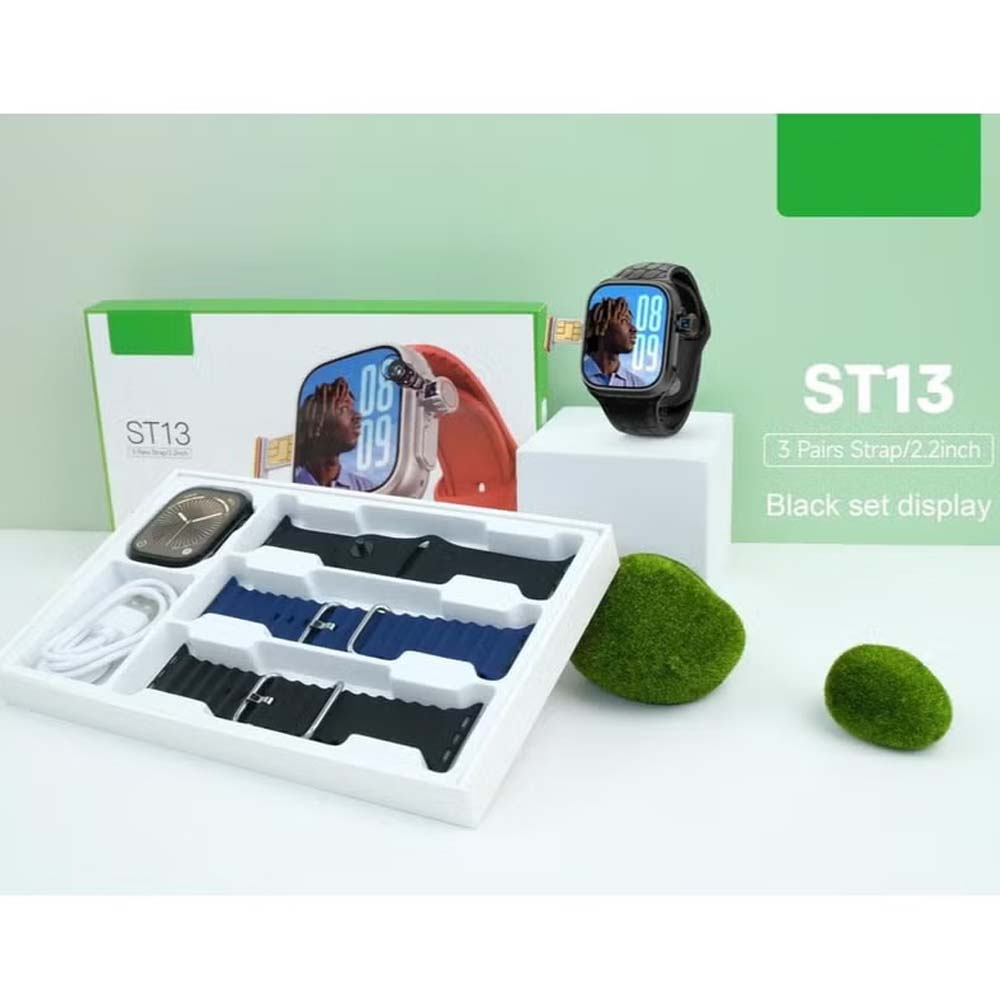 ST13 Smart Watch: 2.2" full-screen display, 4G SIM support, 3 straps & wireless charger. Unisex black design for ladies & gents.