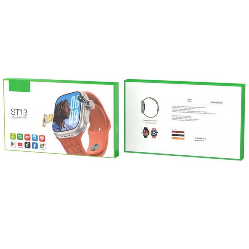 The ST13 Smart Watch is a sophisticated and independent wearable designed to keep you connected and active with modern convenience and style. It features a sleek 2.2-inch full-screen display that offers an expansive, edge-to-edge viewing experience, making it easy to navigate menus, read messages, and view health statistics with clarity. A key feature of this watch is its 4G connectivity through a dedicated SIM card slot, allowing it to operate as a standalone device for making and receiving calls, sending texts, and using mobile data directly from your wrist, without the need for a paired smartphone. This independence is perfect for workouts, travel, or daily errands when carrying a phone is not ideal. The watch comes with three interchangeable straps, providing versatile styling options to suit different occasions, from casual to formal, all centered around a classic black unisex case that appeals to both men and women.Adding to its modern appeal is the convenience of wireless charging, which eliminates the hassle of cables and allows for easy power top-ups. Beyond communication, the ST13 includes comprehensive health and fitness tracking features such as heart rate monitoring, sleep analysis, and multiple sports modes to help you maintain an active lifestyle. It also delivers smart notifications for apps and alerts, ensuring you stay informed. Combining a stylish design with standalone connectivity and practical health tools, the ST13 Smart Watch is a versatile companion for the modern, on-the-go individual.Products 7 Bullet Point:Immersive 2.2-inch full-screen display for clear and easy navigation.Standalone 4G connectivity with SIM card support for calls and data without a phone.Includes three interchangeable straps for customizable style.Features convenient wireless charging for a cable-free experience.Tracks health metrics like heart rate, sleep, and multiple sports activities.Smart notifications keep you updated on messages and app alerts.A versatile unisex smartwatch in black, ideal for both ladies and gents.10 Products Keyword:4G Smart WatchSIM Card SmartwatchFull Screen Display WatchWireless Charging SmartwatchST13 Smart WatchUnisex SmartwatchStandalone SmartwatchInterchangeable Strap WatchFitness Tracker WatchBlack Smartwatch